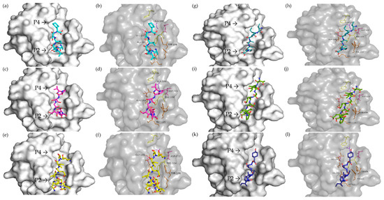The VIPASY peptide bonded with Asp111 via an attractive charge interaction; with Val133, Val156, and Met115 via alkyl interaction; and with Phe112 through a Pi-alkyl bond in the P2 pocket. Between pockets, a Pi-sigma bond was observed with Tyr108. And an alkyl bond occurred in the P4 pocket with Val148 (Figure 5k,l).