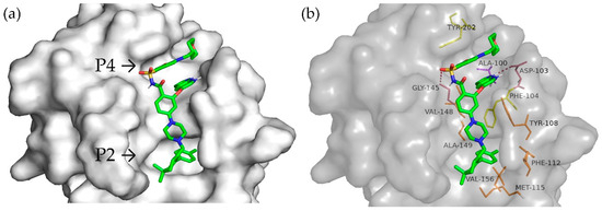 The VPSGTTY peptide interacted with Asp103 via a carbon–hydrogen bond, with Ala100 through an alkyl bond, and with Tyr202 via a Pi-Sigma bond in the P4 pocket. Conventional hydrogen bonds with Asn143, Leu137, and Arg146 occurred between P2 and P4. Only hydrophobic interactions occurred in P2 with Ala149, Met115, and Phe104 (Figure 5c,d).