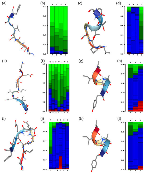 Secondary structure of (a,b) ASVSVSF, (c,d) VPSGTTY, (e,f) QESVIVEISK, (g,h) VIPAAY, (i,j) TISSEDEPF, and (k,l) VIPASY peptides predicted on PEPFOLD4®. Red, green, and blue colors indicate helical, extended, or other state propensities, respectively.