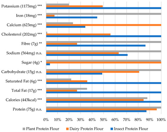 Nutritional values by protein source in the flour/powder category (% of largest value). The largest value (representing 100%) is indicated next to the ingredient name * p <0.05, ** p < 0.01, *** p < 0.001 and n.s. = not significant (based on the one-way ANOVA results).