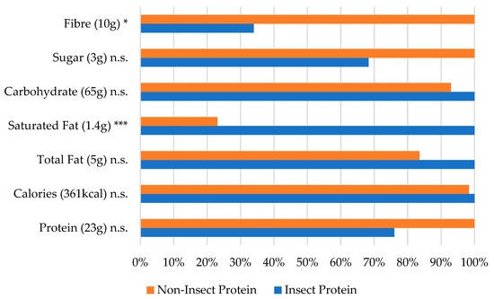 In Figure 2, describing the maximum value percentage of noodles/pasta, significant differences were observed but only in the fibre and saturated-fat levels across insect- and non-insect-enhanced products. However, the nutritional composition of other elements, such as protein, remained similar, with no significant differences observed. This finding suggests that noodles/pasta enriched with different protein sources present comparable nutritional profiles, except for the low-fibre and elevated saturated-fat contents in insect-enhanced products.