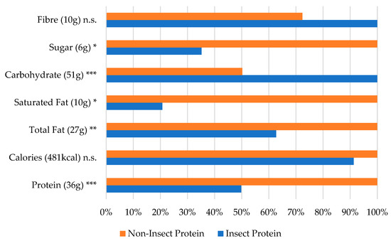 Nutritional values by protein source for the starch-based snack category (% of largest value). The largest value (representing 100%) is indicated next to the ingredient name. * p < 0.05, ** p < 0.01, and *** p < 0.001 (based on the one-way ANOVA results with Box–Cox transformation).