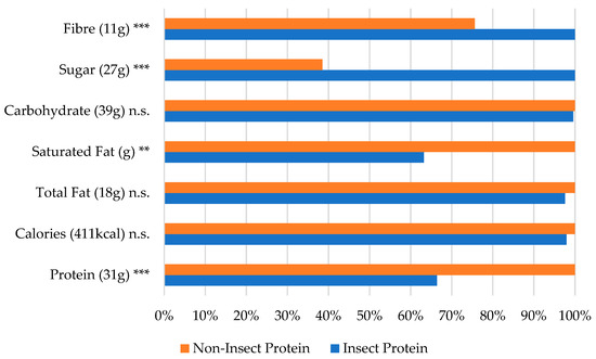 Focusing on the starch-based snacks, Figure 3 illustrates a significantly lower protein content (p < 0.001) in insect-enhanced products compared with non-insect foods, despite the advantages of lower saturated-fat (p < 0.05) and total-fat (p < 0.01) contents in the insect products. A comparison across energy bars, shown in Figure 4, reveals similar results in terms of the protein (p < 0.001) and saturated-fat (p < 0.01) contents in starch-based snacks.