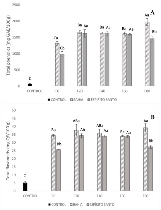 Total phenolic (A) and total flavonoid (B) content in cereal bars. Means followed by uppercase letters indicate that there are no significant differences regarding the formulation. Lowercase letters indicate that there are no significant differences concerning the origins according to Tukey’s test (p > 0.05). The composition of the formulations (F0, F20, F40, F60, and F80) is described in Table 1.