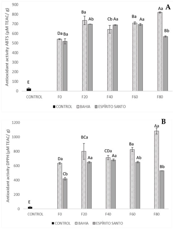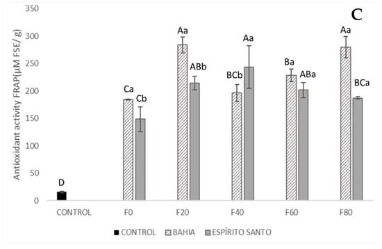 Antioxidant activity in cereal bars: (A) method ABTS, (B) method DPPH, and (C) method FRAP. Means followed by uppercase letters indicate that there are no significant differences regarding the formulation. Lowercase letters indicate that there are no significant differences concerning the origins according to Tukey’s test (p > 0.05). The composition of the formulations (F0, F20, F40, F60, and F80) is described in Table 1.