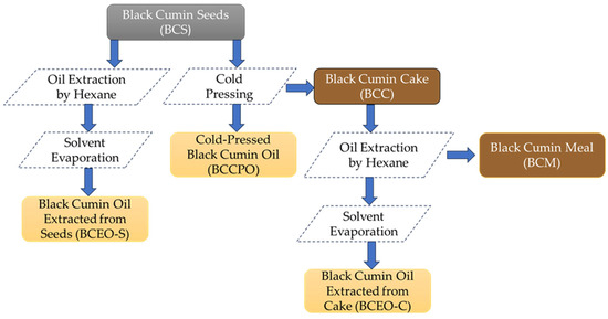 Black cumin (Nigella sativa L.) seeds were kindly provided by a local vegetable oil factory. All studied black cumin samples from various steps of technological processes are presented in Figure 1.