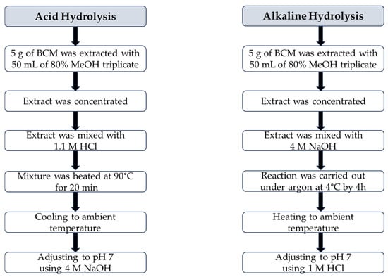 Acid hydrolysis and alkaline hydrolysis of 80% methanolic BCM extract were conducted according to a slight modification of the procedures proposed by Siger et al. [37], as presented in Figure 2.