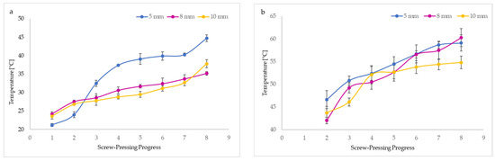 Our findings were consistent with a previous study that reported the highest temperatures (58.33–63.67 °C) of walnut oils pressed from walnut kernels at different rotational speeds (30, 50, 70, and 90 rpm) occurred when the minor nozzle diameter (6 mm) was mounted in a screw press. Lower and similar oil temperatures (38.33–55.33 °C) were observed for the larger nozzle sizes (8 and 10 mm), where the same rotational speeds of the screw press applied [19]. Moreover, the change in nozzle diameter from 6 mm to 8 nm and 10 mm reduced the temperatures of cold-pressed rapeseed oils from 58 to 38 °C [12].