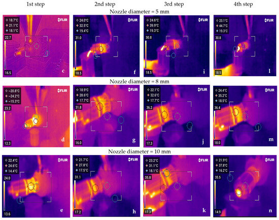Effect of nozzle sizes in screw press on temperatures of black cumin oil (a) and black cumin cake (b) and images of temperature changes during pressing recorded by a thermal camera at the beginning of pressing (1st step) (c–e), during pressing (2nd (f–-h) and 3rd (i–k) steps), and at the end of pressing (4th step) (l–n).