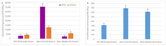 Effects of extraction methods (conventional mechanical extraction, acid hydrolysis, and alkaline hydrolysis) on (a) antioxidant capacity and (b) total phenolic content in black cumin meal. The DPPH, CUPRAC, and TPC were presented as mean (n = 5) with standard deviation (SD). Bars with different letters (a–c) represent significant differences between DPPH, CUPRAC, and TPC in black cumin meal samples (one-way ANOVA and Duncan test, p < 0.05).