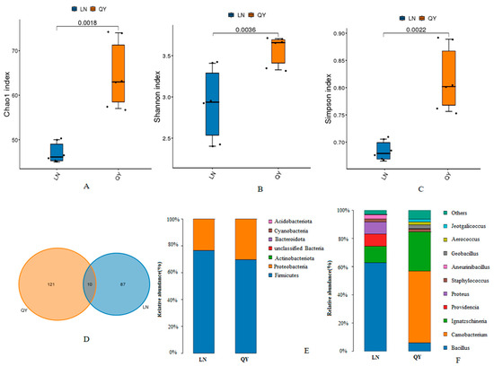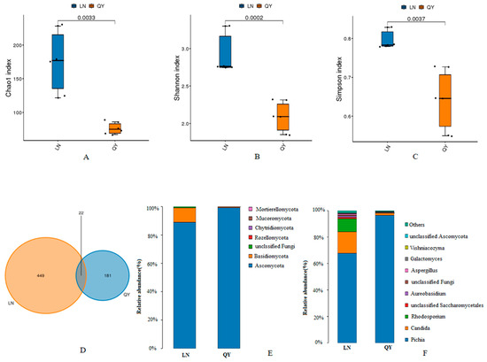 To investigate the variations in the microbial communities in the two types of douchi, we assessed α-diversity using Chao1, Shannon, and Simpson indices. The bacterial diversity was significantly higher in QY than in LN douchi (p < 0.05) (Figure 1A–C). In contrast, the diversity of fungal communities was significantly higher in LN than in QY douchi (p < 0.05) (Figure 2A–C). The total number of bacterial ASVs in the LN and QY samples was 97 and 131, respectively. Among them, 10 ASVs (4.58%) were shared between them, whereas LN and QY had 87 and 121 unique ASVs, respectively (Figure 1D). As for fungi, the LN and QY samples had 471 and 203 ASVs, respectively. Of these, 22 ASVs (3.37%) were shared between them, whereas 449 were unique to LN, and 181 to QY (Figure 2D).