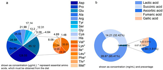 Amino acid (a) and organic acid (b) concentrations. Asp, Aspartic acid; Pro, proline; Glu, Glutamic acid; Phe, Phenylalanine; Ala, alanine; Arg, arginine; Tyr, Tyrosine; Lys, lysine; Ser, Serine; Gly, Glycine; Cys, Cysteine; Ile, Isoleucine; His, Histidine; Val, valine; Leu, Leucine; Met, Methionine; Thr, Threonine. * represents essential amino acids, which must be obtained from the diet.