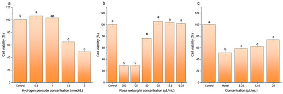 Cell modeling and cell cytotoxicity. (a) Cell viability after intervention with different concentrations of hydrogen peroxide. The horizontal coordinates represent four concentrations of hydrogen peroxide, with 2 mmol/L being the semi-inhibitory concentration (SIC). (b) Cell viability after intervention with different concentrations of RR. The horizontal coordinates indicate six concentrations of the RRE. (c) Cell viability in the control group, model group (SIC), and experimental groups. Different letters indicate a significant difference between groups, p < 0.05.