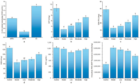 In vitro cellular antioxidant enzyme activity, BCA, and ROS levels. (a) In vitro free radical scavenging capacity; (b) difference in CAT activity of the 5 groups; (c) difference in GSH-PX activity of the 5 groups; (d) difference in SOD activity of the 5 groups; (e) difference in BCA levels of the 5 groups; and (f) difference in intracellular ROS levels of the 5 groups. Different letters indicate a significant difference between groups, p < 0.05.