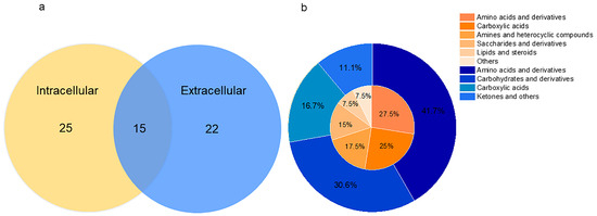 Quantity and composition of intracellular and extracellular metabolites. (a) Wayne diagram of the number of extracellular and intracellular metabolites; (b) the inner circle represents the proportion of intracellular metabolite composition, and the outer circle represents the proportion of extracellular metabolite composition.
