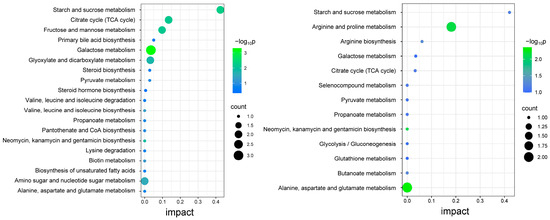 Figure 6 shows the results of the KEGG pathway analysis of intracellular and extracellular differential metabolites, where the horizontal coordinates represent the impact value. The impact value was obtained by normalization, using the degree centrality and the betweenness centrality metrics for each metabolite node [37]. Based on a statistical significance of p < 0.05, five major KEGG metabolic pathways were identified in both the intracellular and extracellular differential metabolites. These differential metabolites were intracellularly enriched in starch and sucrose metabolism, the tricarboxylic acid cycle (TCA cycle), fructose and mannose metabolism, primary bile acid biosynthesis, and galactose metabolism. Extracellularly, they were enriched in starch and sucrose metabolism, arginine and proline metabolism, arginine biosynthesis, galactose metabolism, and the tricarboxylic acid cycle (TCA cycle).