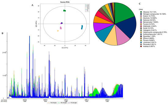 Quality control and sample group analysis of GC×GC–TOFMS. (A) PCA analysis of different groups of Douchi by GC×GC–TOFMS; (B) total ion current chromatogram of GC×GC–TOFMS; (C) classification of identified compounds by GC×GC–TOFMS.