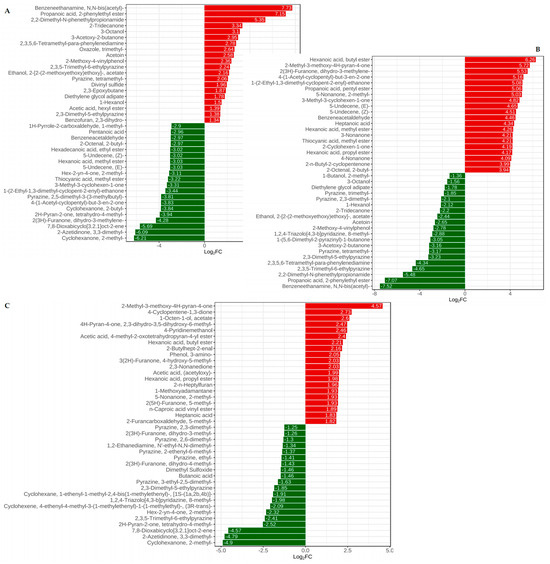 The histogram of main volatile components in Douchi fermented by different strains. (A) The histogram of main different volatile components in Douchi fermented by R. arrhizus and B. circulans; (B) the histogram of main different volatile components in Douchi fermented by A. niger and B. circulans; (C) the histogram of main different volatile components in Douchi fermented by A. niger and R. arrhizus.