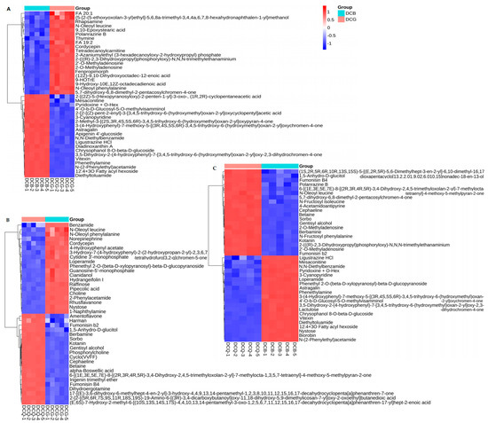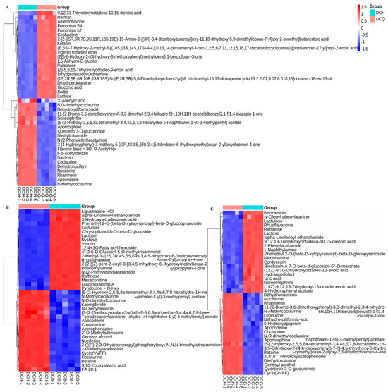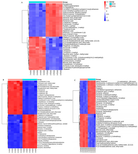 The hierarchical clustering heat map of volatile components with significant differences in Douchi fermented by multi-strain and three pure strains. (A) The hierarchical clustering heat map of main different volatile components in Douchi fermented by multi-strain and A. niger; (B) the hierarchical clustering heat map of main different volatile components in Douchi fermented by multi-strain and B. circulans; (C) the hierarchical clustering heat map of main different volatile components in Douchi fermented by multi-strain and R. arrhizus.