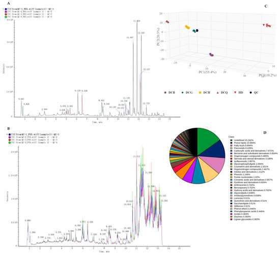 Quality control and sample group analysis of UPLC–Q-TOFMS. (A) Total ion current chromatogram of UPLC–Q-TOFMS in negative ion mode; (B) total ion current chromatogram of UPLC–Q-TOFMS in positive ion mode; (C) PCA analysis of different groups of Douchi by UPLC–Q-TOFMS; (D) classification of identified compounds by GC×GC–TOFMS.