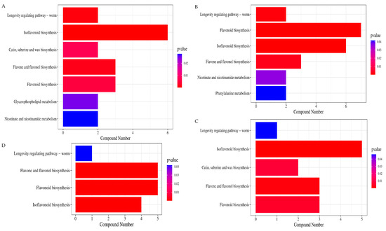 Through KEGG pathway annotation and enrichment of metabolites, the main metabolic pathways with higher abundance were emphatically analyzed. The common metabolic pathways involved in the fermentation of Douchi by the above three microorganisms were isoflavonoid biosynthesis, flavonoid biosynthesis, flavone and flavonol biosynthesis, and longevity regulating pathway (Figure 7A–D).
