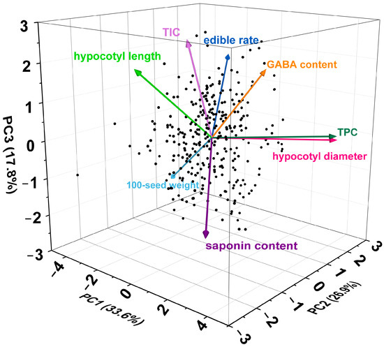 3.4. Comprehensive Evaluation of Sprout Quality Characteristics of 101 Soybean Varieties Based on PCA
