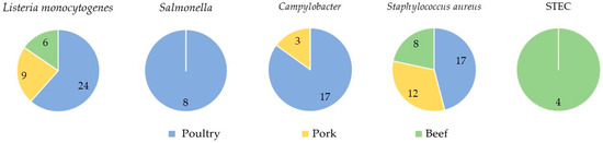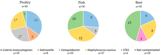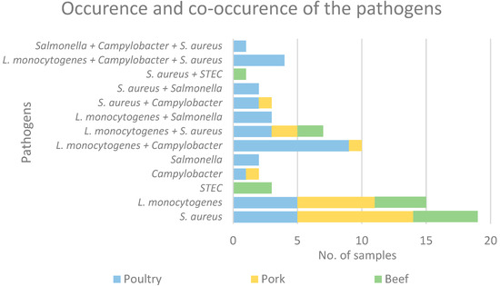 In 31 (31.0%) samples of raw meat tested, the co-occurrence of two (26, 83.9% samples) or three (five, 16.1% samples) pathogens was observed (Figure 3). The most frequently occurring were identified as L. monocytogenes and Campylobacter (14 of 31, 45.2%), followed by L. monocytogenes and S. aureus (11, 35.5%), Campylobacter and S. aureus (eight, 25.8%) and L. monocytogenes and Salmonella (three, 9.7%). Furthermore, the simultaneous prevalence of three pathogens was identified in five samples: L. monocytogenes, Campylobacter and S. aureus (four samples, 12.9%) as well as Salmonella, Campylobacter and S. aureus (one sample, 3.2%). All five samples contaminated with the three pathogens were of poultry meat origin. Meat containing two pathogens simultaneously was also most frequently of poultry origin (19 out of 26, 73.1%), followed by beef (four, 15.4%) and pork (3three, 11.5%). On the other hand, 41 (41.0%) samples were contaminated with only one pathogen: 16 (39.0%) samples of pork, 13 (31.7%) of poultry and 12 (29.3%) of beef.