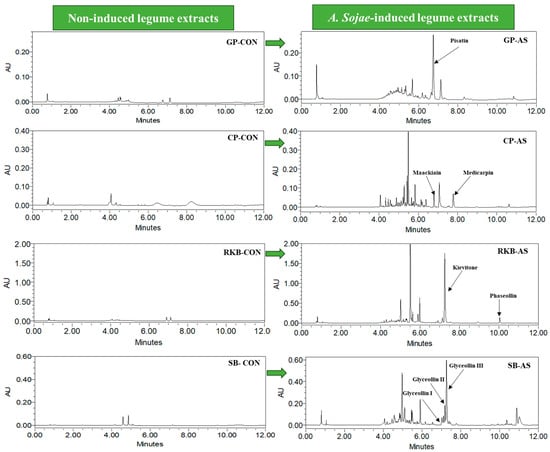 UPLC-DAD chromatogram of phytoalexins in A. sojae-induced and non-induced legume extracts. GP-CON, green pea non-induced; GP-AS, green pea induced; CP-CON, chickpea non-induced; CP-AS, chickpea induced; SB-CON, soybean non-induced; SB-AS, soybean induced; RKB-CON, red kidney bean non-induced; RKB-AS, red kidney bean induced. PDA wavelengths used: GP samples at 310 nm; SB, RKB, and CP at 285 nm.