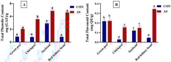 Total phenolic (A) and total flavonoid content (B) of A. sojae-induced and non-induced legume extracts. Results are expressed as mg (GAE)/g and mg (QE)/g for total phenolic and total flavonoid content, respectively. CON, non-induced legumes; AS, induced legumes. Data are presented as mean ± SD. For each assay, values marked with different letters indicate significant differences by Tukey’s multiple comparison test (p < 0.05).