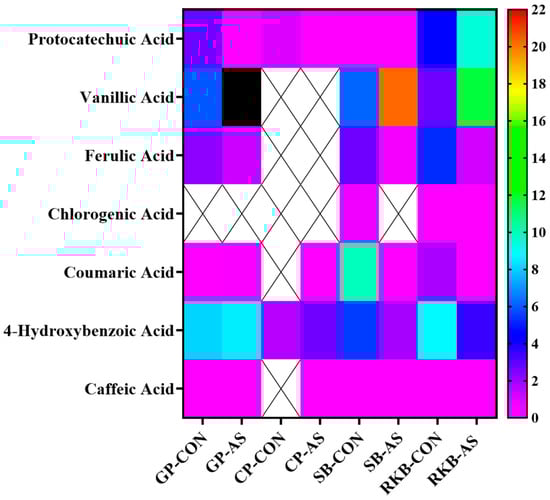Heat map showing distribution and concentration of phenolic acids in A. sojae-induced and non-induced legumes. Orange-colored boxes show higher content among all samples. Black box indicates very high concentration of vanillic acid in GP-AS (out of range; range selected for heat map is 0 to 22). GP-CON, green pea non-induced; GP-AS, green pea induced; CP-CON, chickpea non-induced; CP-AS, chickpea induced; SB-CON, soybean non-induced; SB-AS, soybean induced; RKB-CON, red kidney bean non-induced; RKB-AS, red kidney bean induced.