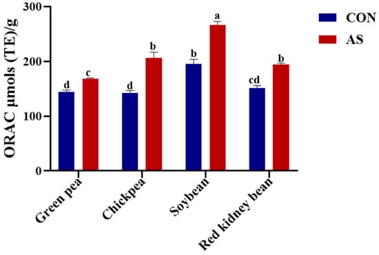 Free radical scavenging assessed by oxygen radical absorbance capacity (ORAC) assay of A. sojae-induced and non-induced legume extracts. Results are presented as mean ± SD. Values marked with different letters indicate significant differences by Tukey’s multiple comparison test (p < 0.05). CON, non-induced legumes; AS, induced legumes.