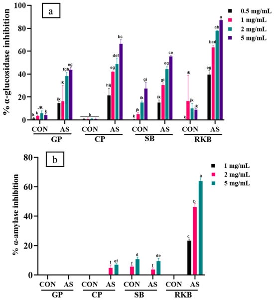 α-glucosidase (a) and α-amylase (b) inhibitory effects of A. sojae-induced and non-induced legume extracts at different concentrations. Results are presented as mean ± SD. Values marked with different letters indicate significant differences by Tukey’s multiple comparison test (p < 0.05). GP-CON, green pea non-induced; GP-AS, green pea induced; CP-CON, chickpea non-induced; CP-AS, chickpea induced; SB-CON, soybean non-induced; SB-AS, soybean induced; RKB-CON, red kidney bean non-induced; RKB-AS, red kidney bean induced.