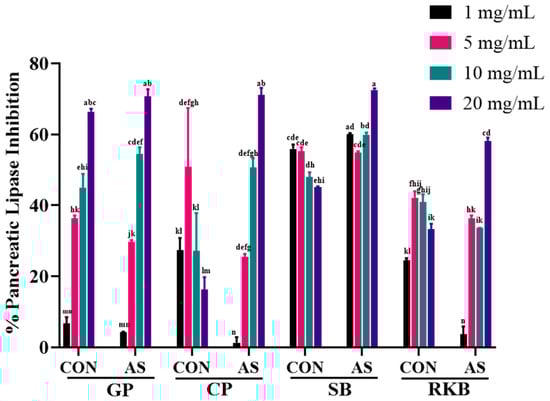 Pancreatic lipase inhibitory effects of A. sojae-induced and non-induced legume extracts at 1, 5, 10, and 20 mg/mL concentrations. Results are presented as mean ± SD. Values marked with different letters indicate significant differences by Tukey’s multiple comparison test (p < 0.05). GP-CON, green pea non-induced; GP-AS, green pea induced; CP-CON, chickpea non-induced; CP-AS, chickpea induced; SB-CON, soybean non-induced; SB-AS, soybean induced; RKB-CON, red kidney bean non-induced; RKB-AS, red kidney bean induced.