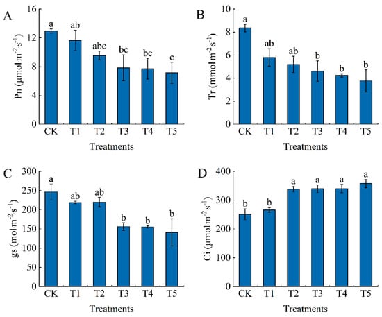 The net photosynthetic rate (Pn), transpiration rate (Tr), and stomatal conductance (gs) of the control treatment were higher than those of the other treatments, and the differences were greater with the greater extent of water deficit (Figure 1A–C). The T1 and T2 treatments were reduced compared with CK, but the differences were not significant. Among them, the T5 treatment had the lower Pn, Tr, and gs values, which were reduced by 44.86%, 55.02%, and 42.81%, respectively, compared with CK. The intercellular CO2 concentration (Ci) of the control was the minimum, and it displayed an increasing trend as the water deficit increased. The T2, T3, T4, and T5 treatments were significantly different from the control CK, with 34.67%, 35.16%, 35.39%, and 42.41% higher Ci than CK, respectively (Figure 1D).