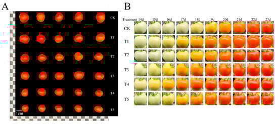 Effect of water deficits on the appearance of tomato fruits. (A) Photograph of the appearance and morphology of tomato fruits during the mature stage; (B) The changes in the appearance and morphology of tomato fruits over different days of treatment. CK: normal irrigation, spontaneously once in 3 days; T1: irrigating once in 4 days; T2: irrigating once in 5 days; T3: irrigating once in 6 days; T4: irrigating once in 7 days; T5: irrigating once in 8 days.