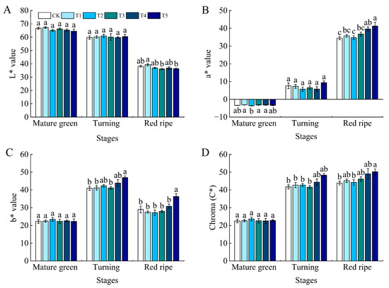 There was no significant difference in the brightness parameters (L*) of tomato fruits in the mature green and the turning stages. In the ripening stage, the L* value of tomato fruits under the T1 treatment was the maximum, and was significantly different from those in the T3 and T5 treatments. As the tomato fruits ripened, the brightness parameters tended to decrease (Figure 4A). The red–green parameter (a*) was the minimum in the mature green stage with treatment T2, and the difference was significant with all other treatments. At the turning stage, treatment T5 was the maximum, but there was no significant difference between the treatments. At the ripening stage, the control was the minimum, and treatment T5 was the maximum. There was no significant difference between the control and the treatments T1, T2, and T3, and significant differences with treatments T4 and T5. The difference in a* value tended to grow significantly as the fruits ripened (Figure 4B). The yellow–blue color (b*) difference of each treatment was not significantly different at the mature green stage, and, at the turning stage, the control was the minimum and the T5 treatment was the maximum. The difference between the control and the T5 treatment was significant, and the difference with the other treatments was not significant. At the ripening stage, the value of the T5 treatment was the maximum, and there was a significant difference with all treatments, which was improved by 25.19% compared with the control (Figure 4C). The color light value parameter (C*) showed an increasing trend with fruit ripening, but there was no significant difference between treatments at the mature green and turning stages. At the ripening stage, the T5 treatment had the maximum value, which was significantly different from the control and T2 treatments, and increased by 14.56% compared to the control (Figure 4D).
