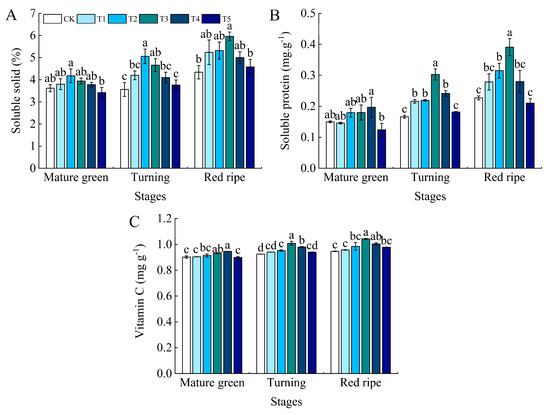As the tomato fruits matured, the soluble solids, soluble proteins, and vitamin C content in all treatment groups showed an upward trend (Figure 5).