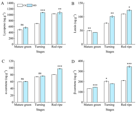 Effect of moderate water deficit on carotenoids in tomato fruits. (A) Lycopene; (B) lutein; (C) α-carotene; (D) β-carotene. CK: normal irrigation, spontaneously once in 3 days; MD: irrigating once in 6 days. The histogram includes a short vertical line that indicates the mean ± SE (n = 3), while asterisks highlight significant differences between treatments based on the Student’s t-test (* p < 0.05, ** p < 0.01, *** p < 0.001, ns: There was no significant difference).