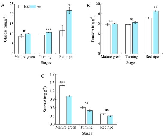 Effect moderate water deficit on the content of sugar components in tomato fruits. (A) Glucose; (B) fructose; (C) sucrose. CK: normal irrigation, spontaneously once in 3 days; MD: irrigating once in 6 days. The histogram includes a short vertical line that indicates the mean ± SE (n = 3), while asterisks highlight significant differences between treatments based on the Student’s t-test (* p < 0.05, ** p < 0.01, *** p < 0.001, ns: There was no significant difference).