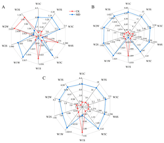 Effect of water deficit on volatile substances in tomato fruits. (A) Mature green stage; (B) turning stage; (C) ripening stage. CK: normal irrigation, spontaneously once in 3 days; MD: irrigating once in 6 days.