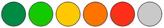 Colors of the evaluation scale: 5—dark green, 4—light green, 3—yellow, 2—orange, 1—red, no evaluation—grey.
