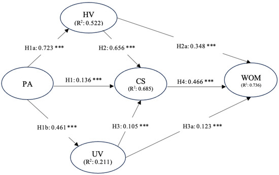 Furthermore, the results obtained in the relationships among the five variables in the hypothesized model allowed for the acceptance of all the proposed hypotheses in this study. The estimated values obtained through PLS-SEM show that PA (β = 0.136, p < 0.001) influences CS, HV (β = 0.723, p < 0.001), and UV (β = 0.461, p < 0.001). Additionally, the results indicated that HV (β = 0.656, p < 0.001) and UV (β = 0.105, p < 0.001) influence CS. Likewise, the HV variable (β = 0.348, p < 0.001) and UV (β = 0.123, p < 0.001) influence WOM. Finally, the analysis showed that CS also influences WOM (β = 0.466, p < 0.001) (See Table 4 and Figure 2).