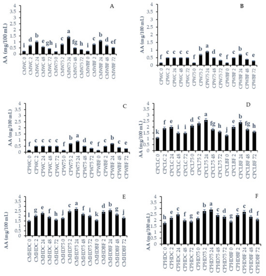 Changes in ascorbic acid concentration during fermentation with different lactobacillus strains on pumpkin leaf (Cucurbita moschata or C. pepo) and melon smoothies. (A) Cucurbita moschata and Watermelon smoothies fermented with LABs; (B) Cucurbita pepo + Watermelon LABS smoothies fermented with LABs; (C) Cucurbita moschata + Cantaloupe smoothies fermented with LABs; (D) Cucurbita pepo + Cantaloupe smoothies fermented with LABs; (E) Cucurbita moschata + Honeydew smoothies fermented with LABs; (F) Cucurbita pepo + Honeydew smoothies fermented with LABs. Mean values were calculated based on three replicate samples. Different letters in the same bar refer to statistical difference at p < 0.05 according to Fisher’s protected LSD test. Keys: Cucurbita moschata + Watermelon (CMWC), Cucurbita moschata + Watermelon + L75 (CMW75), Cucurbita moschata + Watermelon + B. longum (CMWBF), Cucurbita pepo + Watermelon Control (CPWC), Cucurbita pepo + Watermelon + L75 (CPW75), Cucurbita pepo + Watermelon + B. longum (CPWBF), Cucurbita moschata + Cantaloupe Control (CMCLC), Cucurbita moschata + Cantaloupe + L75 (CMCL75), Cucurbita moschata + Cantaloupe + L75 (CMCL75), Cucurbita pepo + Cantaloupe Control (CPCLC), Cucurbita pepo + Cantaloupe + L75 (CPCL75), Cucurbita pepo + Cantaloupe + B. longum (CPCLBF), Cucurbita moschata + Honeydew Control (CMHDC), Cucurbita moschata + Honeydew + L75 (CMHD75), Cucurbita moschata + Honeydew + B. longum (CMHDBF), Cucurbita pepo + Honeydew Control (CPHDC), Cucurbita pepo + Honeydew + L75 (CMHD75), and Cucurbita pepo + Honeydew + B. longum (CPHDBF).