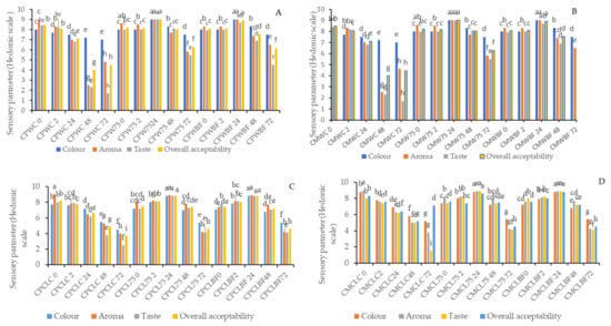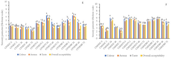 Sensory properties of pumpkin leaf (Cucurbita moschata or C. pepo) and melon smoothies fermented with different lactobacillus strains. Different letters in the same bar refer to statistical difference at p < 0.05 according to Fisher’s protected LSD test. (A,C) Cucurbita moschata + Cantaloupe smoothies fermented with LABs; (B,E) Cucurbita pepo + Cantaloupe smoothies fermented with LABs; (D,F) Cucurbita pepo + Watermelon smoothies fermented with LABs; Keys: Cucurbita moschata + Watermelon (CMWC), Cucurbita moschata + Watermelon + L75 (CMW75), Cucurbita moschata + Watermelon + B. longum (CMWBF), Cucurbita pepo + Watermelon Control (CPWC), Cucurbita pepo + Watermelon + L75 (CPW75), Cucurbita pepo + Watermelon + B. longum (CPWBF), Cucurbita moschata + Cantaloupe Control (CMCLC), Cucurbita moschata + Cantaloupe + L75 (CMCL75), Cucurbita moschata + Cantaloupe + L75 (CMCL75), Cucurbita pepo + Cantaloupe Control (CPCLC), Cucurbita pepo + Cantaloupe + L75 (CPCL75), Cucurbita pepo + Cantaloupe + B. longum (CPCLBF), Cucurbita moschata + Honeydew Control (CMHDC), Cucurbita moschata + Honeydew + L75 (CMHD75),Cucurbita moschata + Honeydew + B. longum (CMHDBF), Cucurbita pepo + Honeydew Control (CPHDC),Cucurbita pepo + Honeydew + L75 (CMHD75) and Cucurbita pepo + Honeydew + B. longum (CPHDBF).