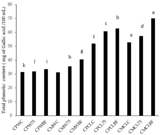 Changes in total phenolic content during fermentation with different lactobacillus strains on pumpkin leaf (Cucurbita moschata or C. pepo) and melon smoothies. Mean values were calculated based on three replicate samples. Different letters in the same bar refer to statistical difference at p < 0.05 according to Fisher’s protected LSD test. Cucurbita pepo + Watermelon Control (CPWC), Cucurbita pepo + Watermelon + L75 (CPW75), Cucurbita pepo + Watermelon + B. longum (CPWBF), Cucurbita moschata + Watermelon Control (CMWC), Cucurbita moschata + Watermelon + L75 (CMW75), Cucurbita moschata + Watermelon + B. longum (CMWBF), Cucurbita moschata + Cantaloupe Control (CMCLC), Cucurbita moschata + Cantaloupe + L75 (CMCL75), Cucurbita moschata + Cantaloupe + B. longum (CMCLBF), Cucurbita Moschata + Cantaloupe Control (CMCLC), Cucurbita Moschata + Cantaloupe+ L75 (CMCL75), and Cucurbita Moschata + Cantaloupe + B. longum (CMCLBF).