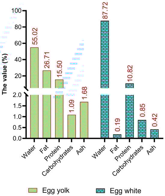 In addition to being an inexpensive source of protein and a modest calorie source (approximately 140 kcal/100 g), eggs contain a tremendous amount of essential fats, vitamins, and minerals (Figure 1) [23,24]. Although the relative concentrations of minerals, vitamins, and fatty acids in eggs differ among national standards, major components such as water, protein, lipids, and carbohydrates are globally comparable [24,25]. The stability of the primary nutrients in eggs primarily depends on the egg white-to-yolk ratio, whereas minor components can be affected by factors such as the hen’s diet. Fresh eggs typically contain approximately 76.1% water, 12.6% protein, 9.5% fat, 1.1% ash, and 0.7% carbohydrates [26].