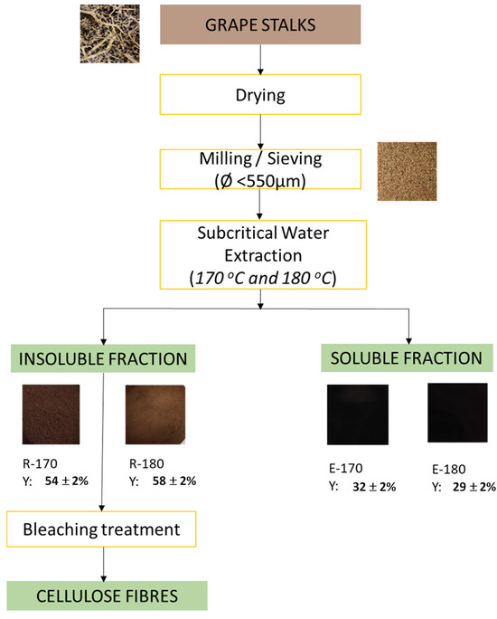 Figure 1 shows the flow chart of the process applied to revalorise grape stalks, where the values of mass yields (Y: dry out-flow mass to dry in-flow mass) of the different fractions obtained in the SWE process steps at both 170 °C and 180 °C, are specified.