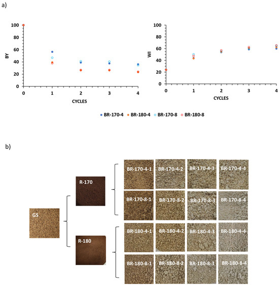(a) Bleaching yield (BY) and whiteness index (WI) obtained with the different one-hour treatment cycles with alkaline hydrogen peroxide at 4 and 8% v/v. The LSD intervals are 2.22 for BY and 0.03 for WI. (b) Images of the raw material, subcritical water extraction (SWE) residues at 170 °C (R-170) and 180 °C (R-180), and bleached residues (BR) at the different steps of the bleaching process. Bleached residues are coded as the BR temperature of SWE concentration (% v/v) of alkaline hydrogen peroxide number of 1 h bleaching cycles.