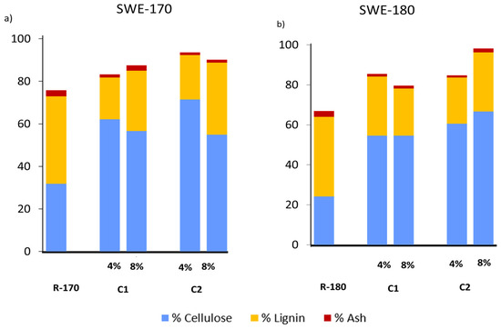 Structural components were also analysed in the samples R-170 and R-180 after one and two bleaching cycles, with 4% and 8% hydrogen peroxide solutions, since no progress in the cellulose purification after two cycles can be deduced from the bleaching yield development (Figure 2a). Table 3 shows the content of cellulose, lignin, and ashes of the different lignocellulosic residues, referred per mass unit of GS to evaluate the mass balances better, and the global yield of the fraction submitted to the corresponding process steps. Hemicellulose was not reflected in Table 3 since no quantitative amounts of xylose and arabinose could be detected in the bleached samples. Therefore, the small hemicellulose amount in the extraction residues R-170 and R-180 (Table 2) was practically eliminated after the first alkaline bleaching cycle. Likewise, approximately 65–75% of lignin from GS was removed during the two bleaching cycles without significant effect on the hydrogen peroxide concentration. After bleaching, the R-180 sample had slightly lower lignin content than R-170, which suggests a better aptitude for bleaching of the sample extracted at the highest temperature, as previously observed for other lignocellulosic residues submitted to a previous SWE step [14,20]. The combined treatments provoked a remarkable reduction of ashes in the cellulosic fractions due to their progressive lixiviation in the liquid phases promoted by the weakening of the matrix and the increased exposure area during the different treatments. Figure 3 shows the contents (g/100 g sample) of cellulose and lignin reached after the two bleaching cycles in comparison to those of the non-bleached residues (R-170 and R-180).