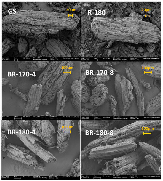FESEM images of cellulose fibres after two bleaching cycles with 4% or 8% (v/v) alkaline hydrogen peroxide solutions (BR-170-4, BR-170-8, BR-18-4, and BR-180-8), compared with non-bleached fibres from subcritical water extraction at 180 °C (R-180) and grape stalk (GS) samples.